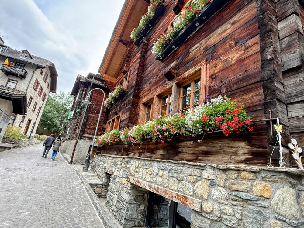 趣のある木造のシャレー建築は、窓辺に飾られた色とりどりの花々(ゼラニウムなど)が美しく、歩いているだけで心が和みます。