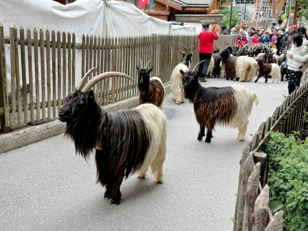 お土産屋さんでフサフサの毛を持つヤギのぬいぐるみを見て、「この子に会いたいね」と話していました。店を出てすぐ、カウベルの音が近づいてきて、ヤギの群れが山から村へ戻ってきたのです!